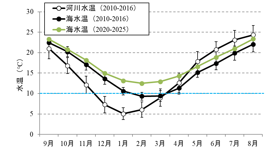 河川水温は最近のデータが公表されていないのでわからないが、海水温は一年を通して高くなっていて、とりわけ1~4月ごろで高くなっている。まさに孵化後の仔鮎の海洋生活期間に一致するから、遡上の早遅や夏遡上期間などに大きな変化をもたらしていることが予想できる。