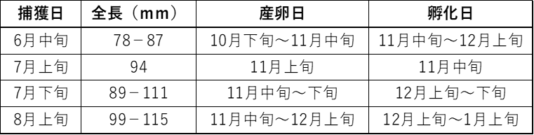 だとすれば、1月上~中旬に産み落とされた鮎は翌秋11月中旬に全長10㎝以下で産卵し、その産み落とされた個体は6~7カ月間の海洋生活を経て6~8月ごろに河川に遡上してきた。