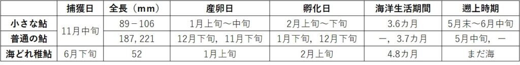 まさにこういった遅生まれ個体は遅生まれなんだからそりゃ海で成長する期間がずれ込み遡上時期が遅れる夏遡上鮎になるんだわね…といった考察。